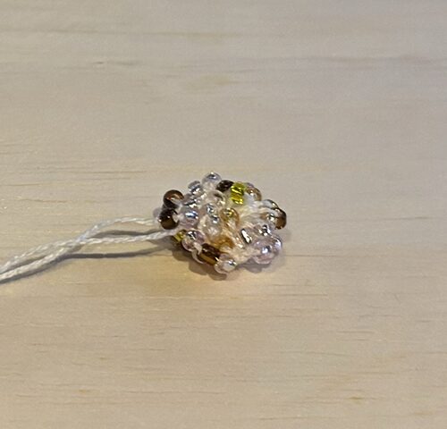 編み方は輪を編む方法で、6目から細編みで、細編み1目毎に1つのビーズを入れます。